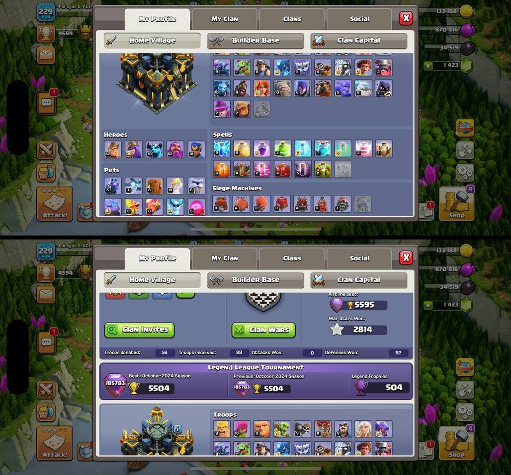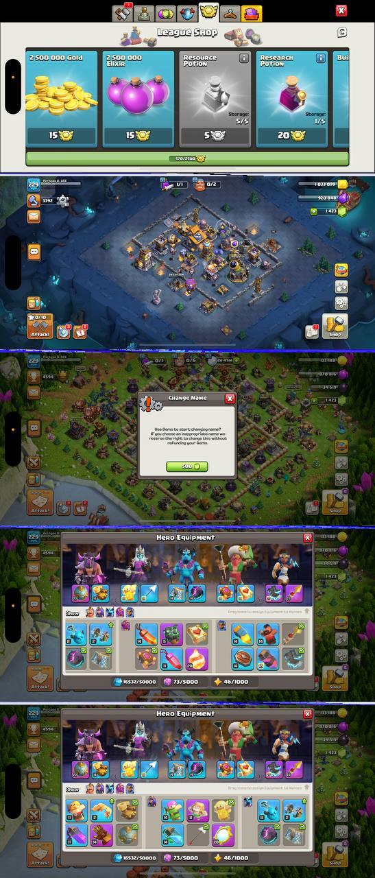229 XP | TH17 | 8 EPIC EQUIPS | HEROES 82-100-70-62-41 | 8 HERO SKINS | 2814 WAR STARS | BH-10 | 500 GEMS RENAME