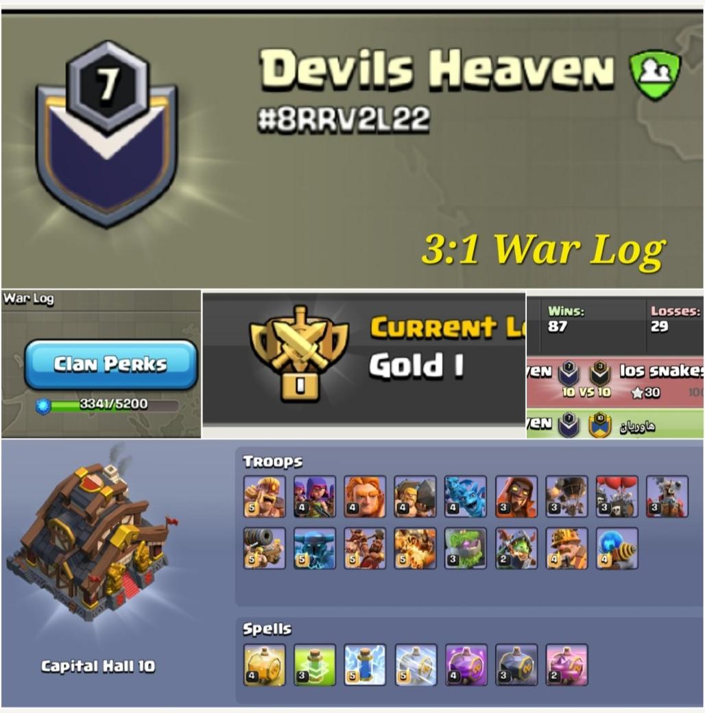 3:1 War Log -- Name:- Devils Heaven -- Clan Lvl 7 -- Gold 1 -- Capital hall 10 -- Win- 87 - loss- 29 -- Troops max -- Fa