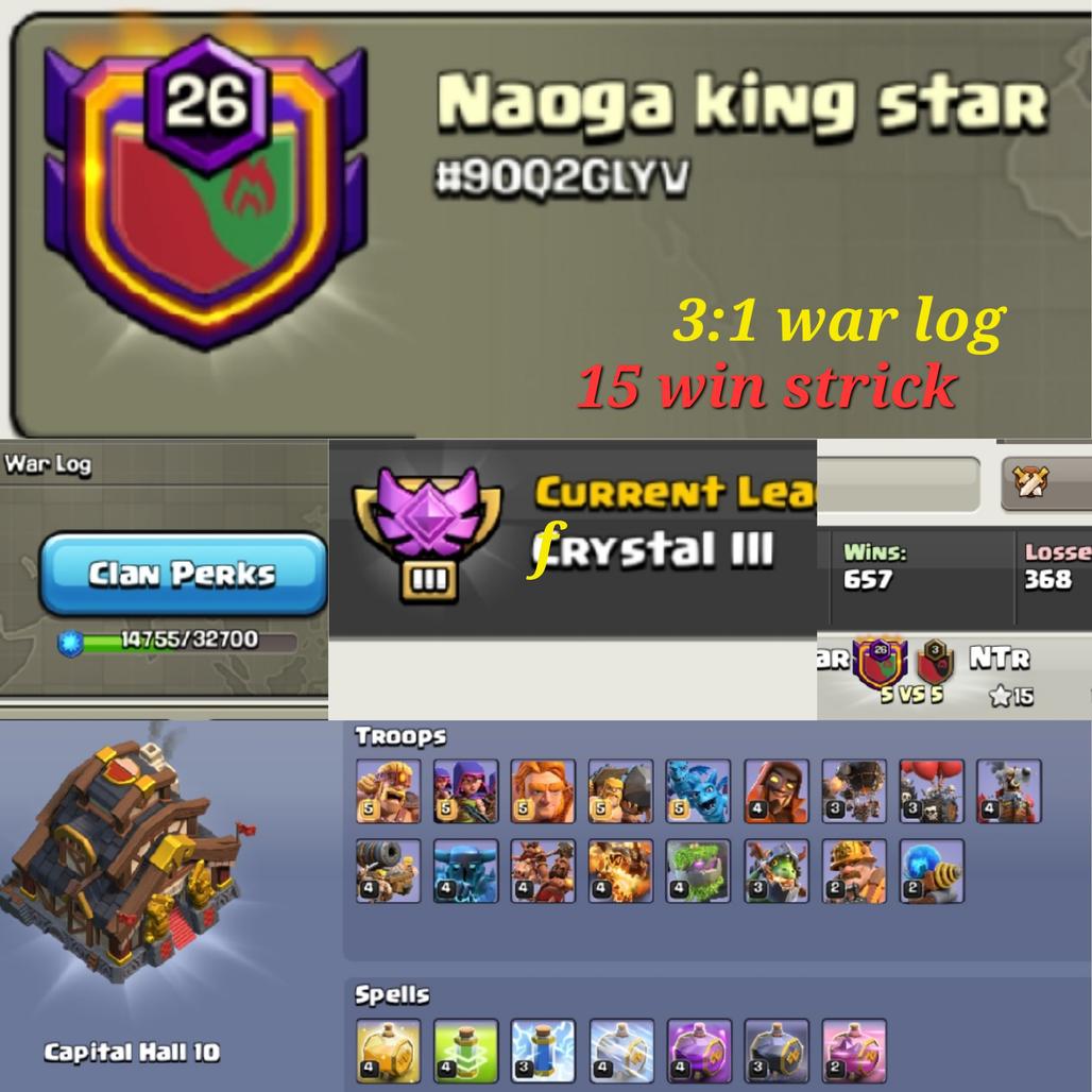 3:1 War Log -- Name:- Naoga King Star -- Clan Lvl 26 -- Crystal 3 -- 15 Win strike -- Capital hall 10 -- Win- 657 - loss- 368 -- Troops max -- Fast delivery -- No Random