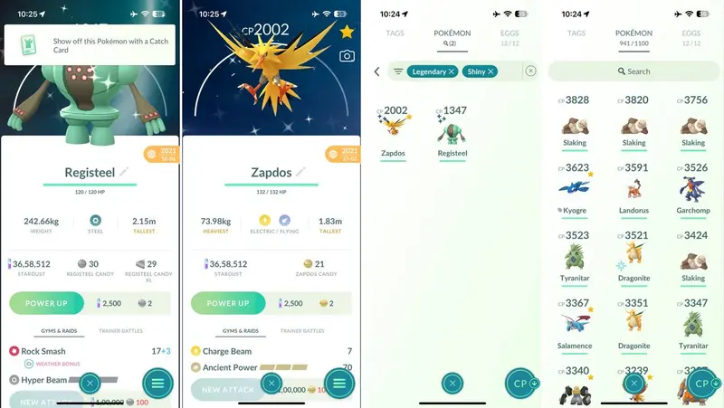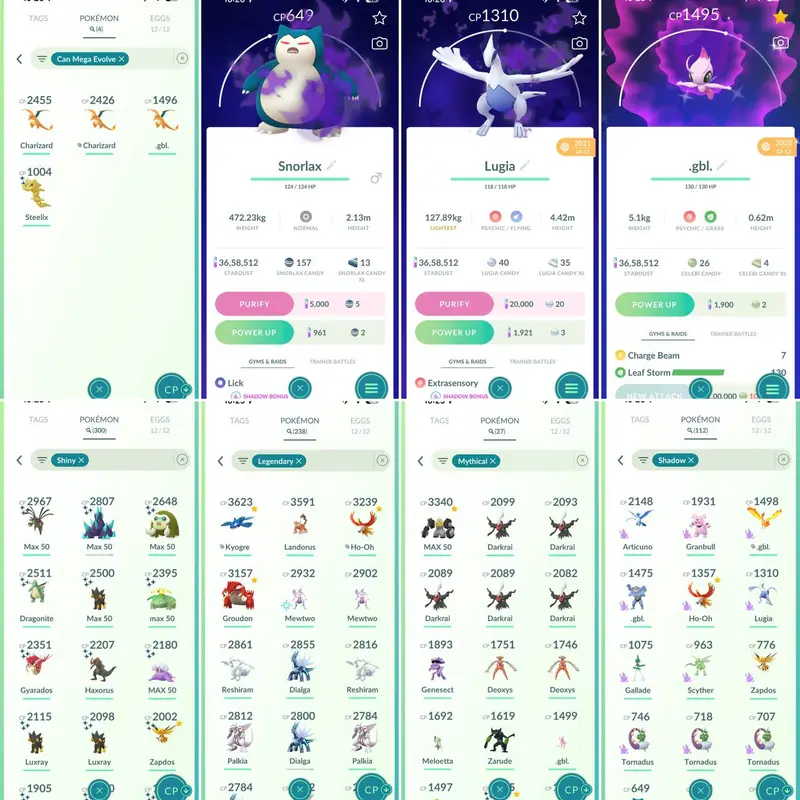 300 SHINY 🔥 238 LEGENDARY 💎 LEVEL 69 [] 3.6M DUST [] SHADOW SNORLAX [] SHINY LEGENDARY REGISTEEL ZAPDOS