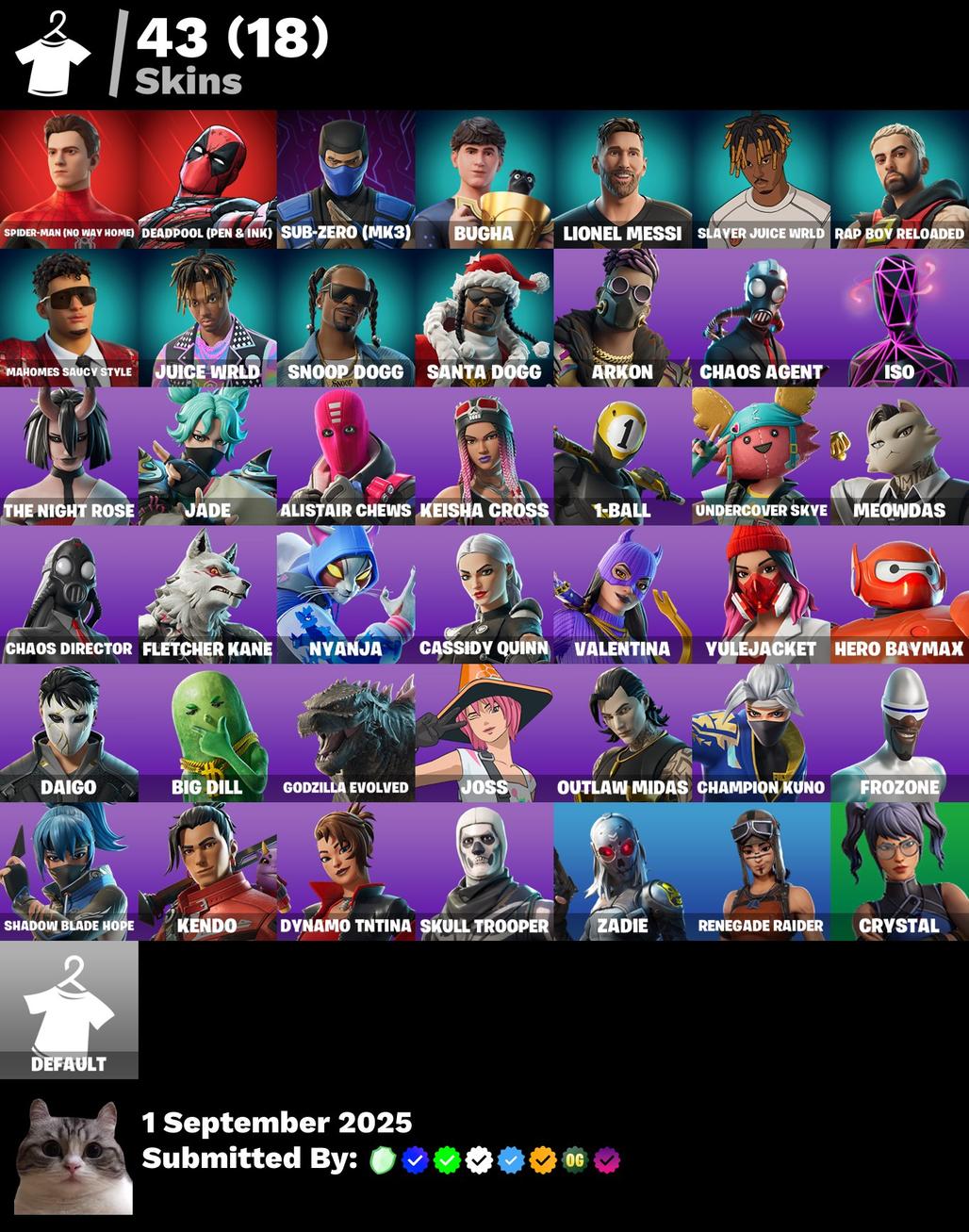 43 Skins | Zadie | Chaos Agent | Snoop Dogg | Bugha | Crystal | Iso | Skull Trooper | Juice WRLD | Renegade Raider
