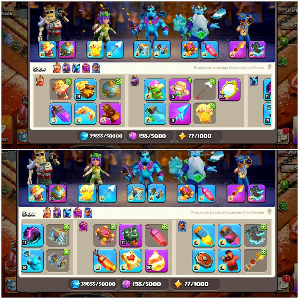 5 HERO MAX-TH17 MAX-11 EPIC EQUIPMENT-2014-2024 RARE X MAS TREE-4K WAR STAR-MAX DEFENSE-GOOD TROOPS-MAX NIGHT VILLAGE