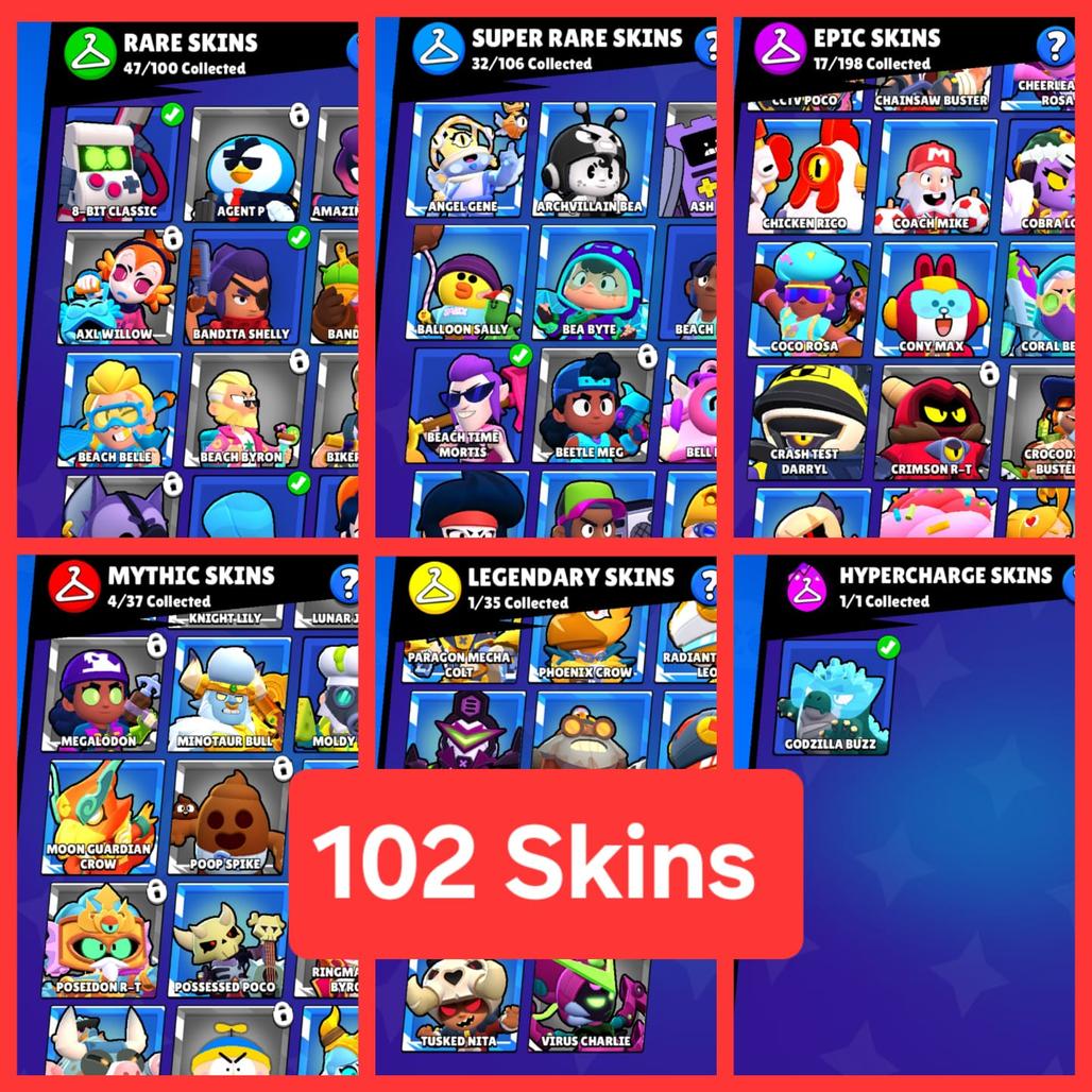 🎭 Total Skins: 102 (🟢 47 Rare, 🔵32 Super Rare, 🟣17 Epic, 🔴 4 Mythic, 👑 1 Legendary , ⚡1 HYPER)