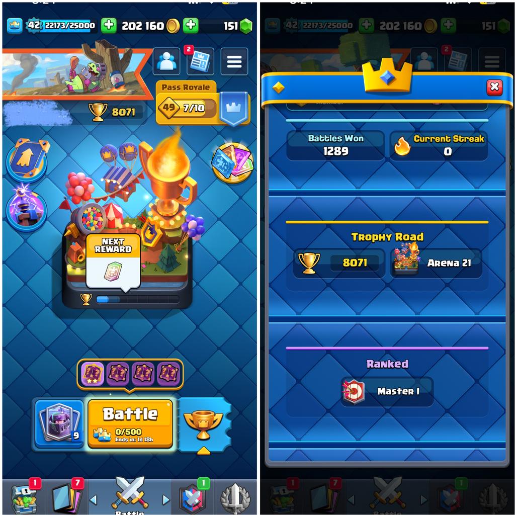 8071 Trophies | Level 42 | King Tower 14 | Arena 21 | Emote 38 Cards 113 | P354
