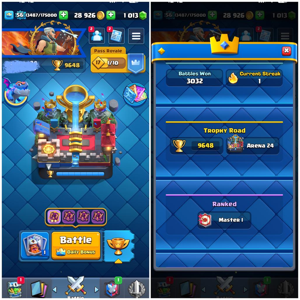 9648 Trophies | Level 56 | King Tower 15 | Arena 24 | Emote 72 Cards 119 | P454