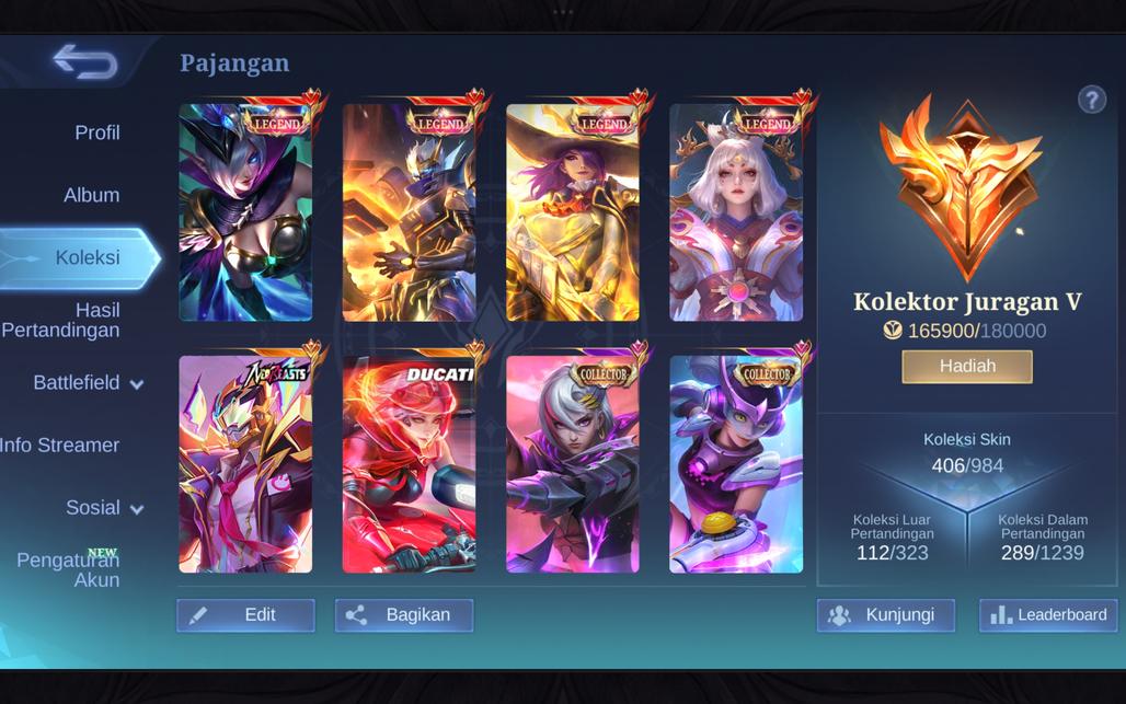Account Skin 406, 4 Skin Legend, 4 Collector, JJK Melisa, NEO Fredrinn, DUCATI Bened, ASPI Angela 2 KOF, 3 TF