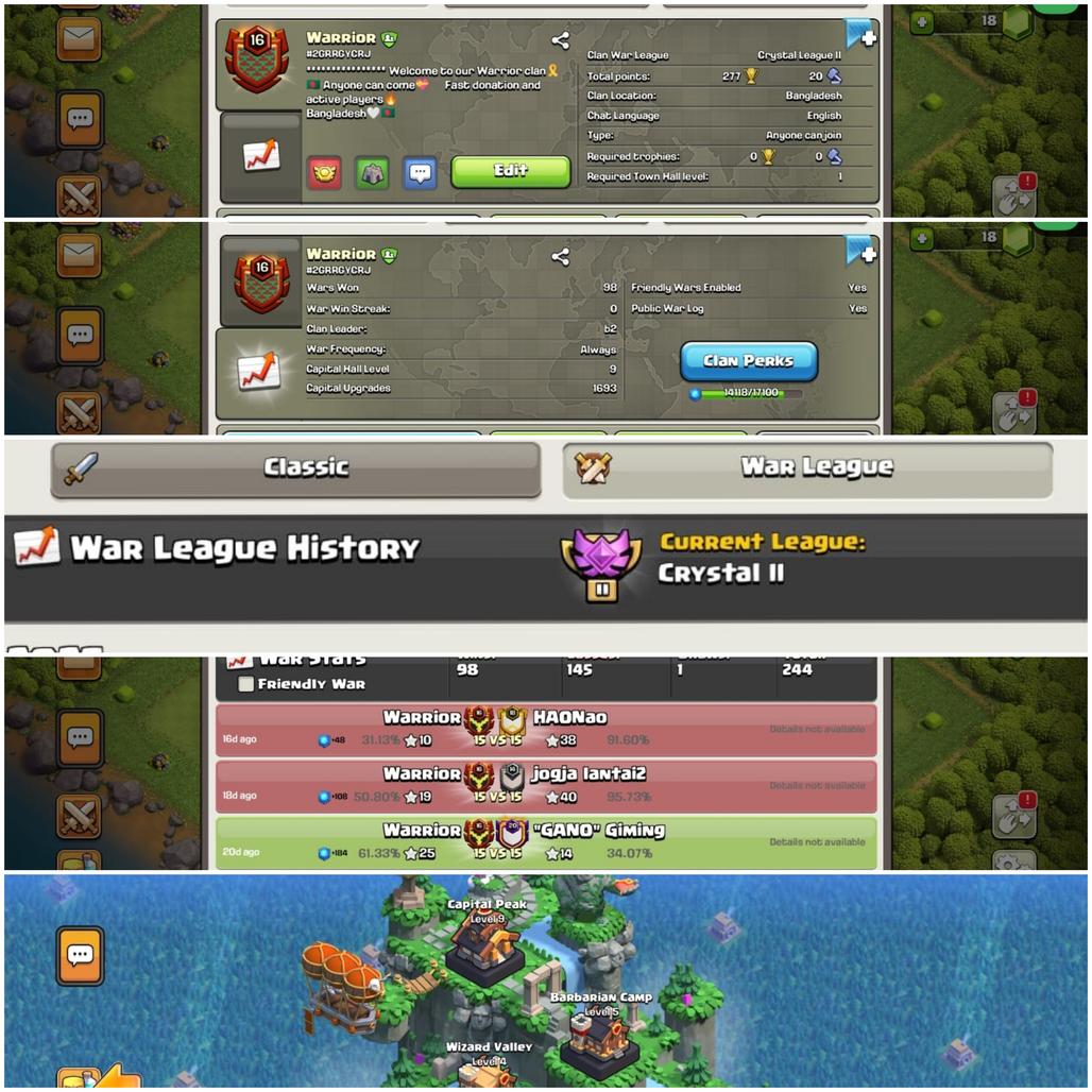 CLAN LEVEL 16 CRYSTAL LEAGUE 2 NAME Warrior RARE ENGLISH NAME CLAN CAPITAL 9 WIN98 LOSS145 LOW PRICE