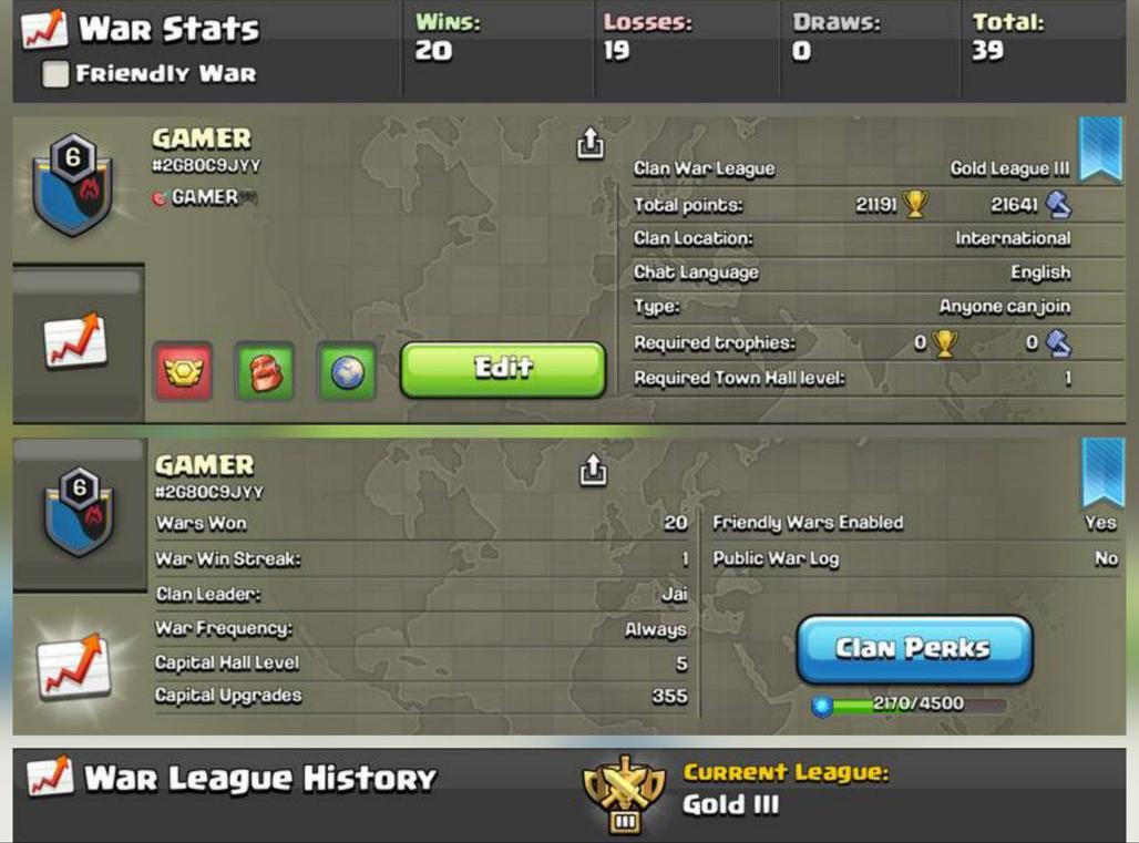 CLAN LEVEL 6 | GAMER | CAPITAL HALL 5 | GOLD III LEAGUE | WARLOG 19-20