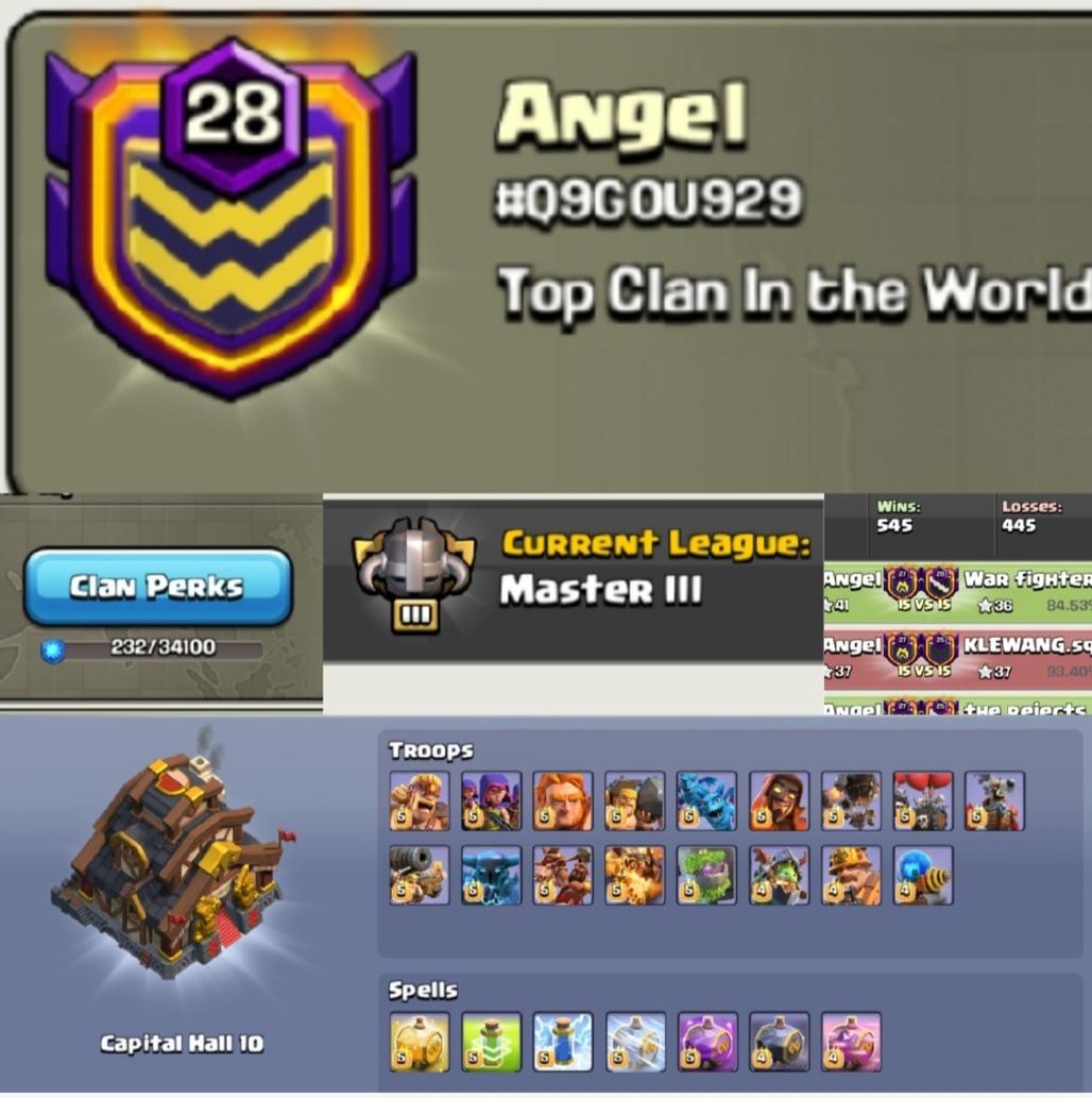 Clan name :- Angel -- Clan LvL- 28 -- Master 3 -- Capital hall- 10 -- Win- 545 - loss- 445 -- Full Troops max -- 3331 Upgrade -- Fast Delivery