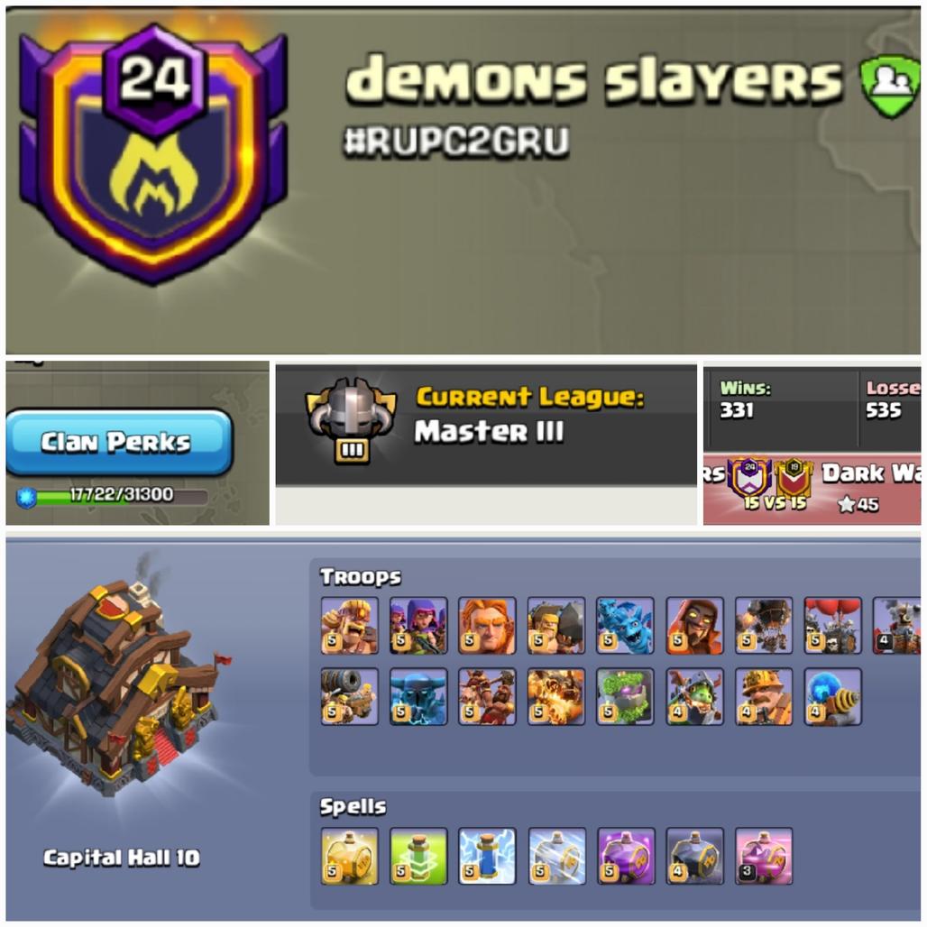 Clan Name:- Demons Slayers -- Clan Lvl 24 -- Master 3 -- Capital hall 10 -- Win- 331- loss- 535-- Troops max -- Fast de