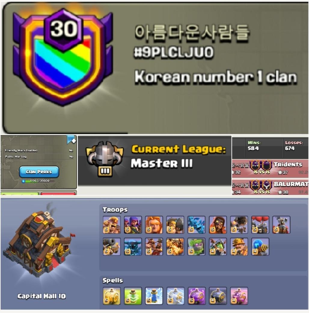 Clan Name:- Korean -- Clan Lvl 30 -- Master 3 -- Capital hall 10 -- Win- 584 - loss- 674 -- Troops max -- No
