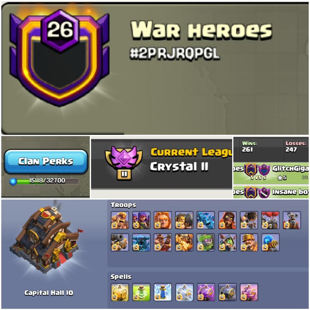 Clan Name:- War Heroes -||- Lvl - 26 -||- Crystal 2 -||- Capital hall 10 -||- Win 261 -- Loss 247 -||- Good Name -||-