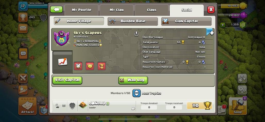 LEVEL 12 [] CLAN NAME: SKY SCRAPERS [] CAPITAL HALL: 3 [] WAR WON: 180 [] CWL: GOLD 3
