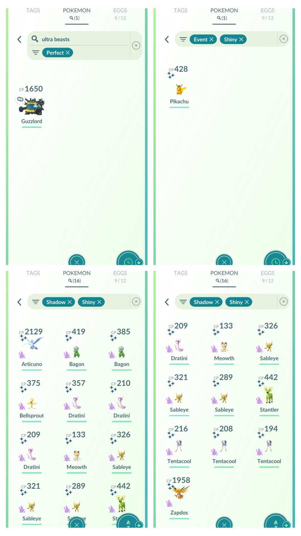 • Shadow & Shiny : 19 [Articuno, Bagon (2), Bellsprout, Dratini (3),Entei, Meowth, Regigigas, Sableye (3), Skorupi, Stantler, Tentacool (3), Zapdos]