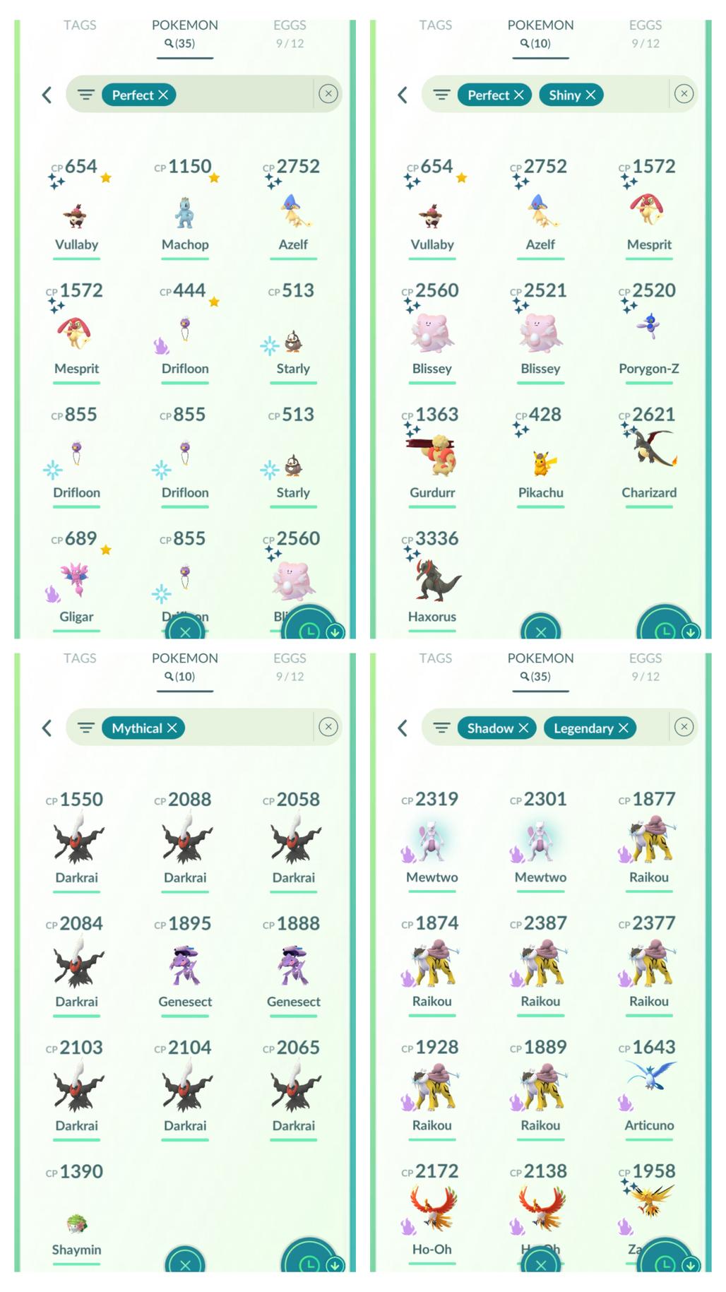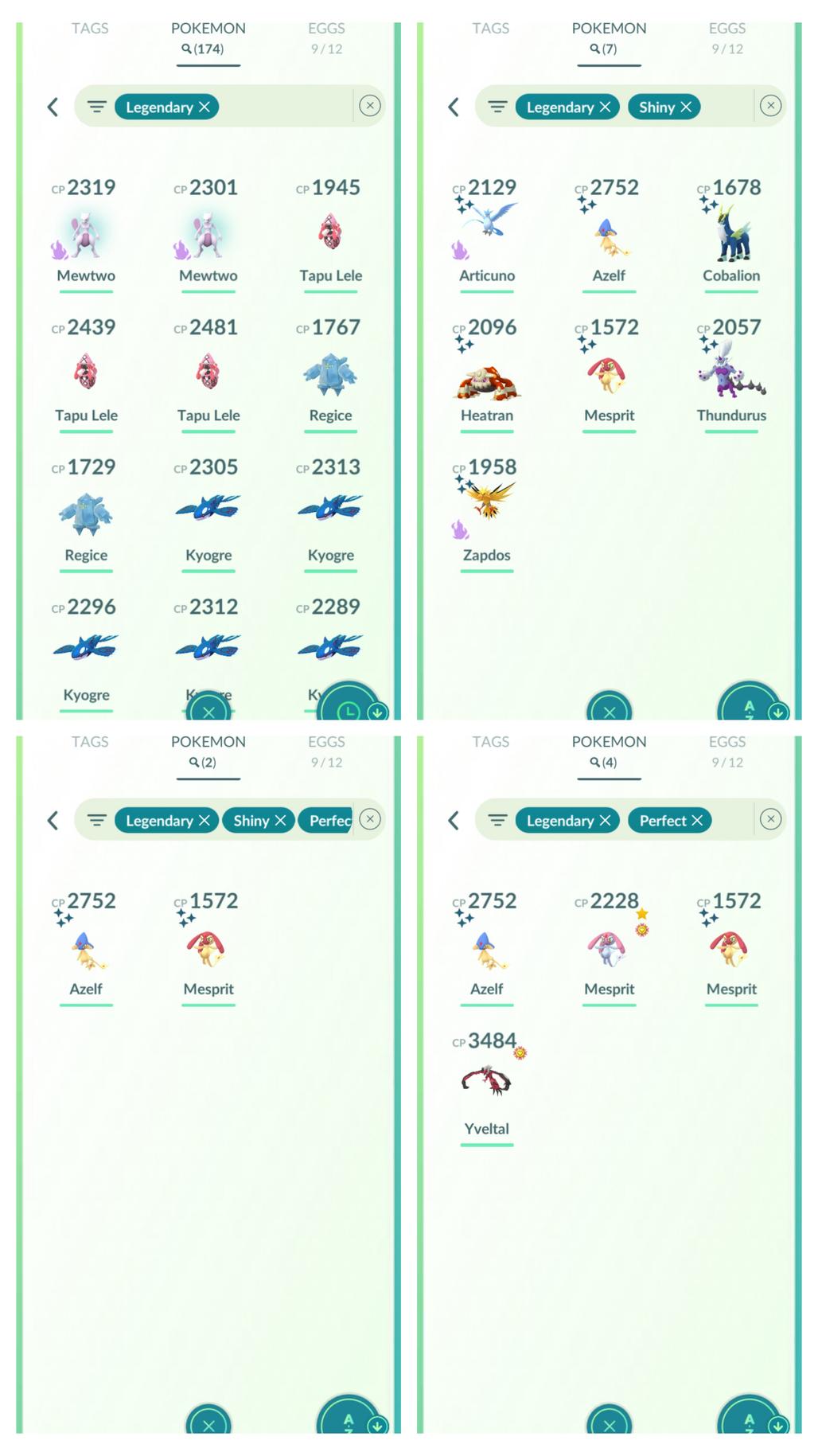 • Shiny & Legendary : 31 [ Articuno *Shadow, Azelf (2) , Cobalion, Dialga, Entei *Shadow, Giratina *Altered, Giratina *Origin(2), Groudon, Kyurem, Latios (2) Mesprit, Palkia, Rayquaza, Regigigas *Shadow, Tapu Bulu (5),Tapu Fini (3), Tapu Lele, Thundurus, Xerneas, Yveltal (2), Zapdos *Shadow ]