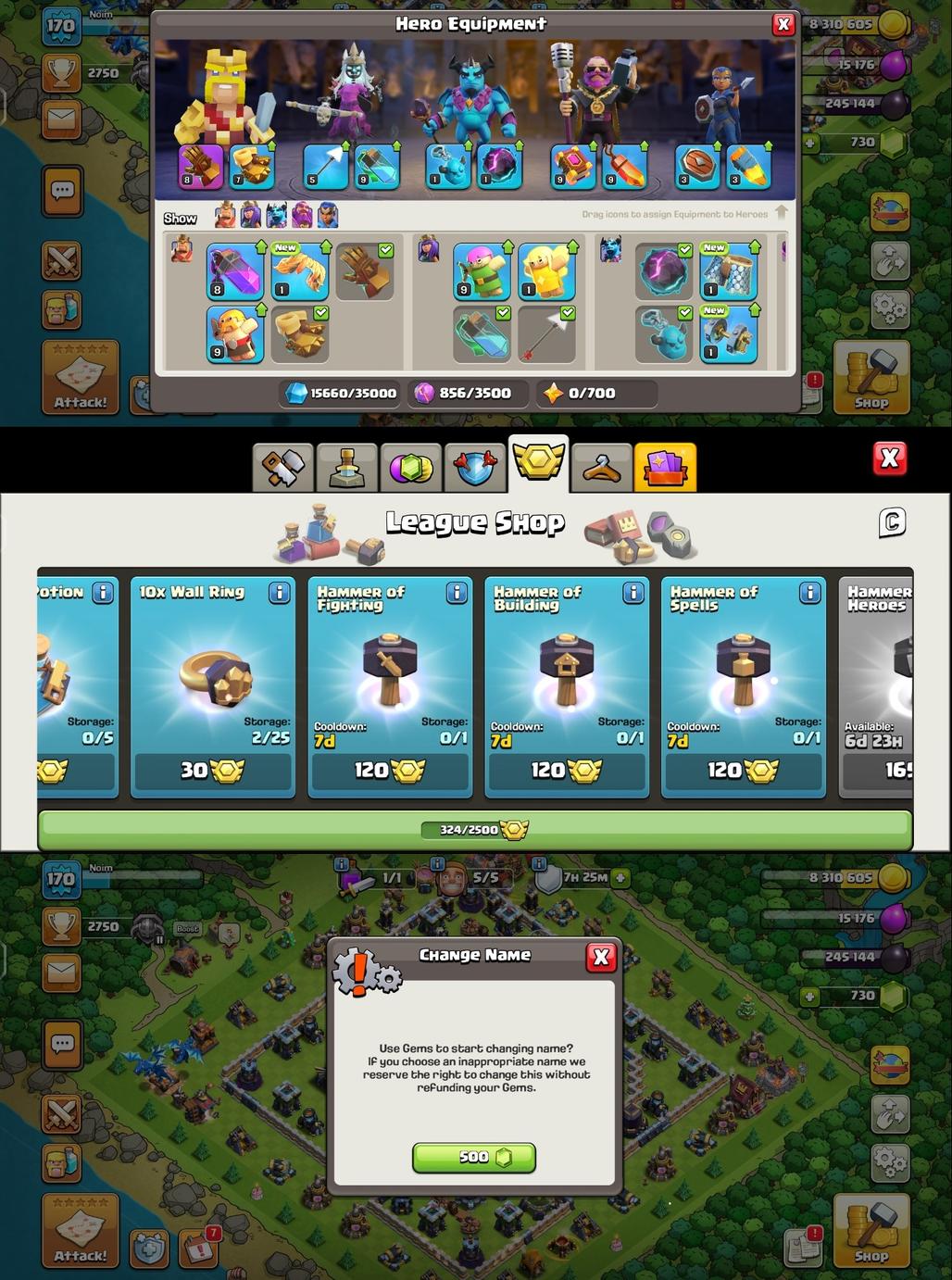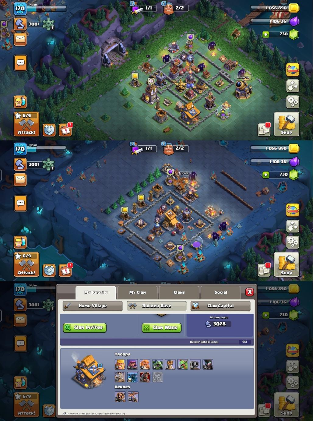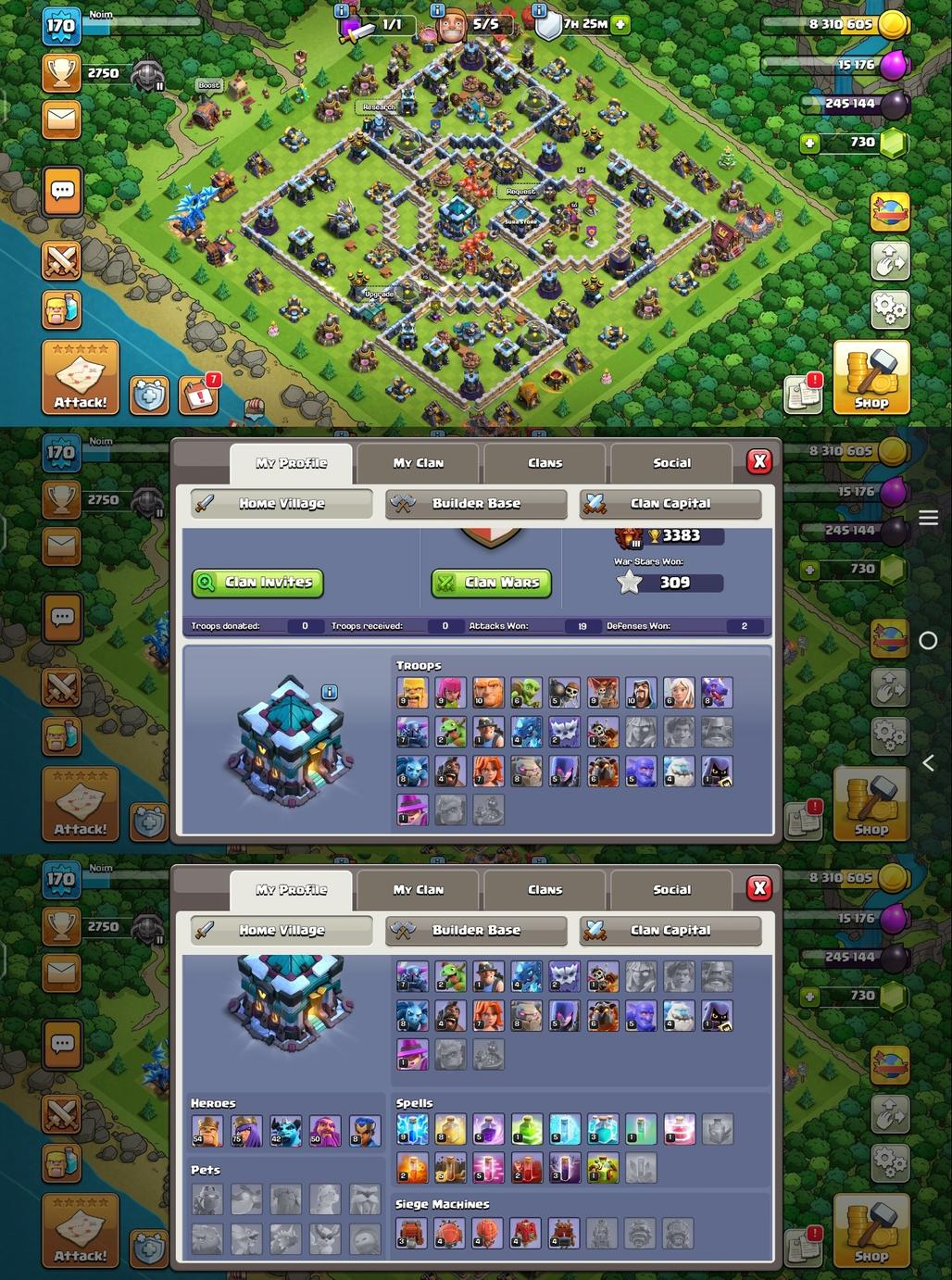 N1915||Th13 Max||Defence Maxed||2 Hero Max:54-75-42-50-8||Unique 6 Skin||Epic Gaint Gauntlet||Builder Base:10||Level:170