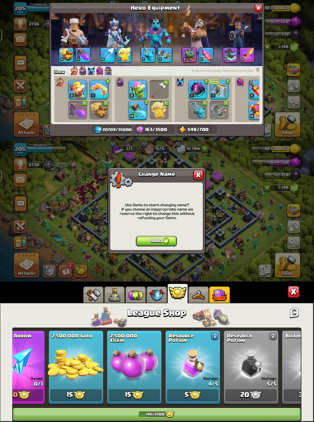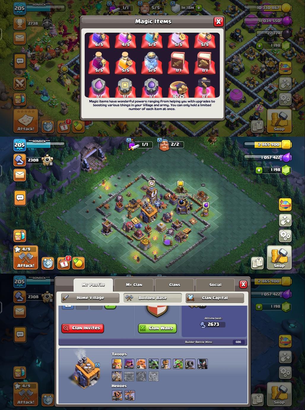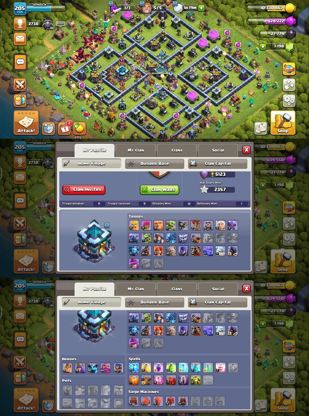 R1863||TH13 Fully Maxed||Nothing Left||Gem:1198||3 Epic 2 Epic Maxed||Heroes:75-75-42-50-25||Level:205||War Star:2357||Jolly King||