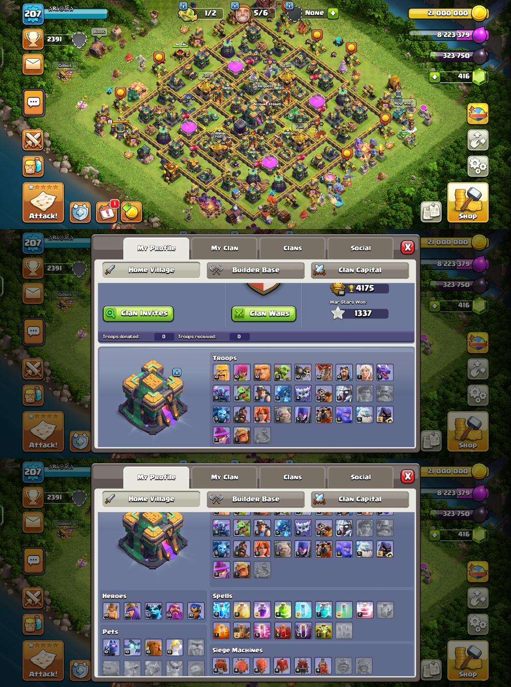 R1865||Th14 Fully Maxed|||6 Builder||Heroes Max:80-80-53-55-30||7 Epic Equipment||Level:207||All Pet Max||All Seige||BH:10||