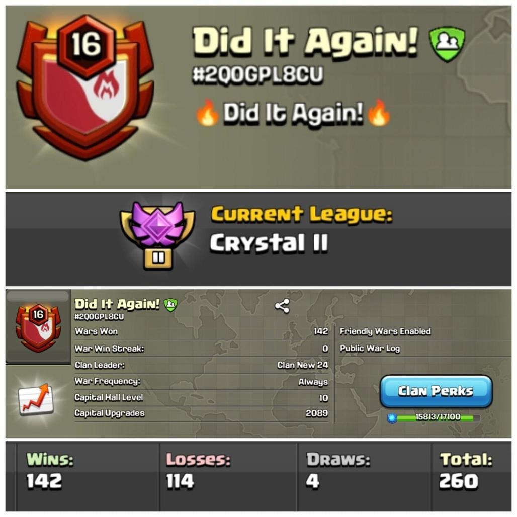 Level 16 clan || clan capital 10 || crystal 2 || warlog 142-114 || name -Did it Again!