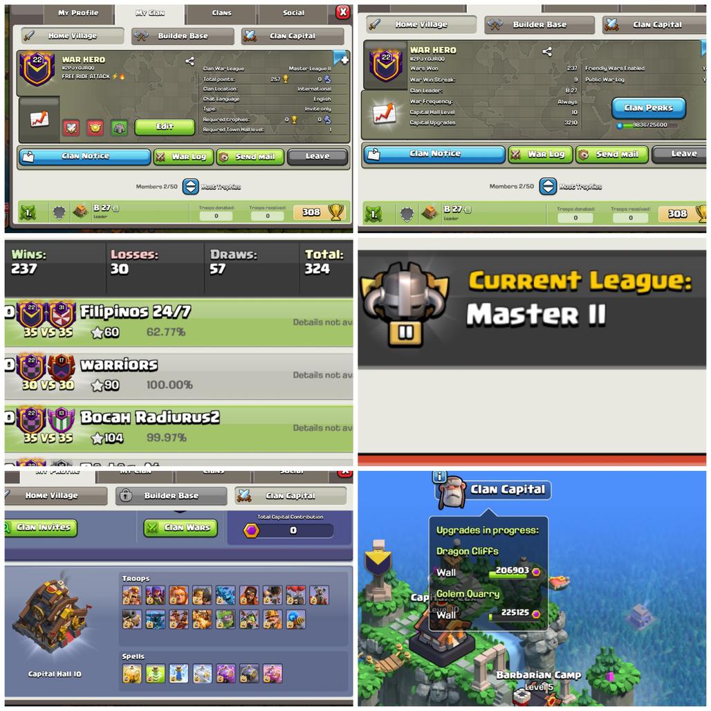 RARE CU- 3210 | TROOPS MAX | LEVEL 22 | CLAN CAPITAL-10 MAX NAME: WAR HERO | MASTER 2 WIN- 237 | LOSS- 30