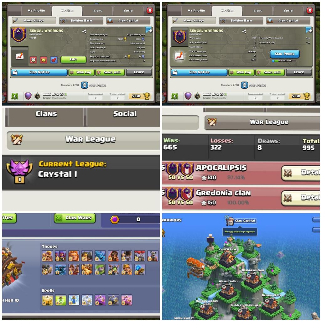 RARECU 3331 TROOPS ALL MAX LEVEL 27 CLAN CAPITAL10 NAME: BENGAL WARRIORS CRYSTAL 1 WIn 665 LOSS 382