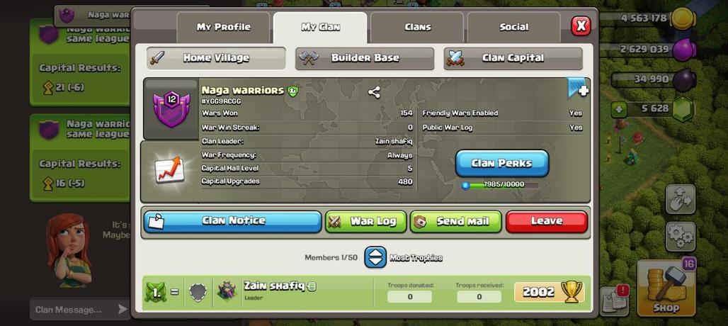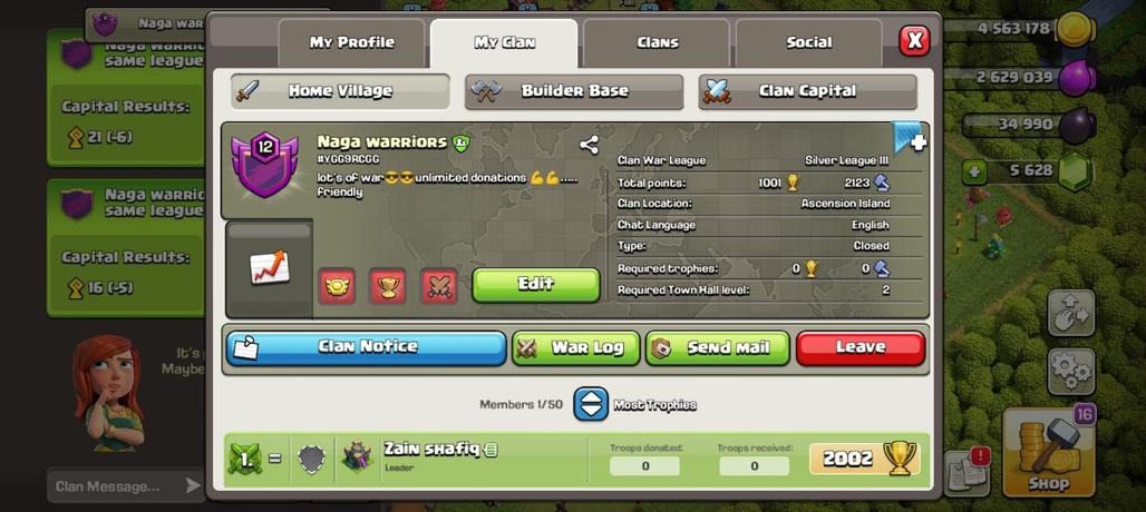 LEVEL 12 [] CLAN NAME: NAGA WARRIORS [] CAPITAL HALL: 5 [] WAR WON: 154 [] CWL: SILVER 3