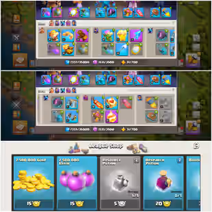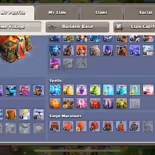CHEAPEST !! TH15 PRE MAX- 74-78-51-55-30 - 175 XP Lvl - 5 EPIC EQ. - LEAGUE MEDALS - STACK Magic Items - A709